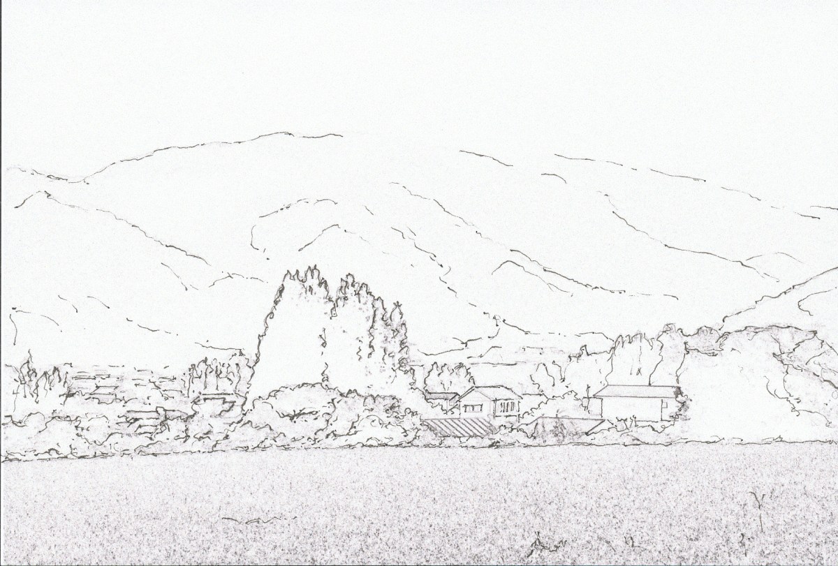 霧がかかる山並み実線画