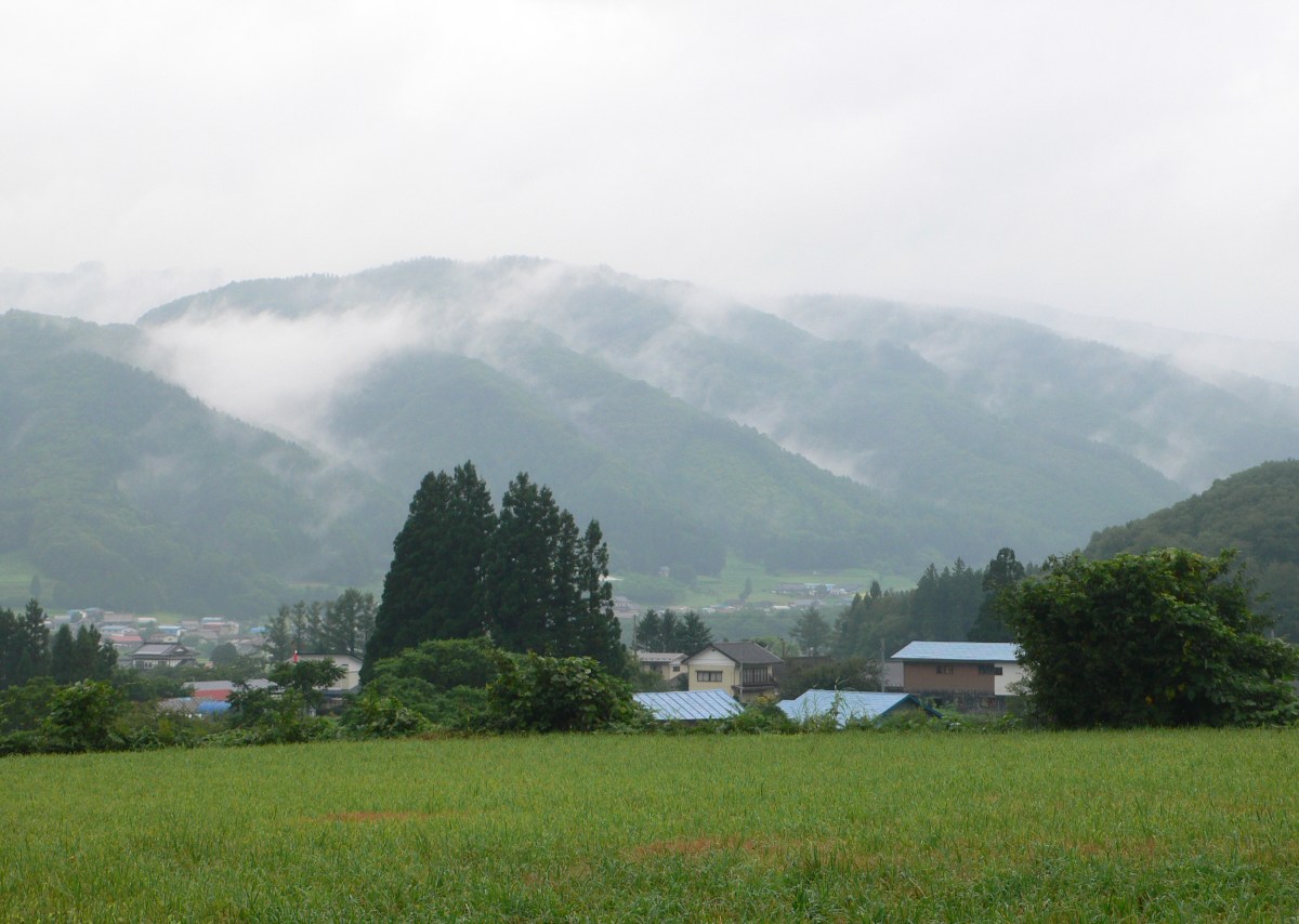 17.霧がかかる山並みと山村